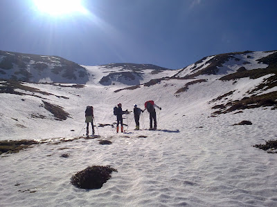 Això s'acaba, almenys al Pirineu oriental... Ja fa dies que les calorades van fer mal, molt mal. El vent del sud ha cremat la neu i no ha quedat massa res. Després que la setmana passada pugéssim per la vall de la Comalada, vam intuir que la neu duraria poc...Ens vam consolar dient, que si pel sud havíem calçat esquís a 2100 aproximadament, com seria que a la cara nord no els calçaríem una setmana més tard a semblant cota? Així doncs, el Puigmal per França havia de ser possible...!