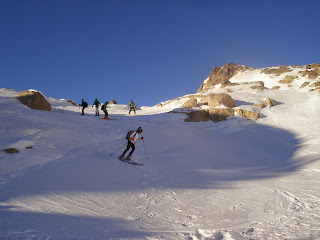 El dia 2 toca tornar a investigar. La carretera que puja al coll de la Bonette està tancada massa avall per intentar cims en aquesta zona, així que anem fins a Sant Dalmas le Selvage i anem direcció al coll de l'anyella per després anar direcció el cim de l'Alpet. Hem sortit d'avall però amb neu des del cotxe i anem remuntant per una pista fins passat el coll. Un cop allà prenem una altra pista fins que ens creuem amb uns esquiadors de muntanya locals que venen del Tete Marselleise. Ells han pujat en cotxe fins aquí, per la pista nevada amb 4x4. Quan nosaltres arribem, ells ja marxen...això és arribar a misses dites. Seguim les traces i ens fiquem a la vall en comptes de la carena. Segurament per fer cim l'hauríem encertat més per la carena, però a la vall és tan bonica i té tanta neu que els ulls hi han anat sols. Un cop a sota al cim, provem primer d'enfilar-nos per la vessant nord, però la quantitat de neu i la pendent ens fan desistir, doncs tot el vessant està ple de corredors d'allaus (tot i que el risc d'allaus el marcava 1). Canviem i ens fixem amb el pic de la Roche, amb una roca molt grossa i característica. Remuntem la vall fins a uns 2350, fins que la neu s'encrosta fort i decidim treure pells i baixar. La ruta ha estat llarga i volem baixar junts al cotxe. Bona baixada a la part central amb neu pols, després a la pista més escassa...sort que no hi ha el granit dels Pirineus perquè sinó hauríem arribat al cotxe sense esquís!!!.